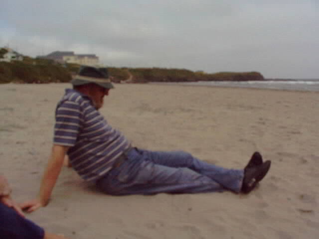 Tom reclining on the sandy beach.